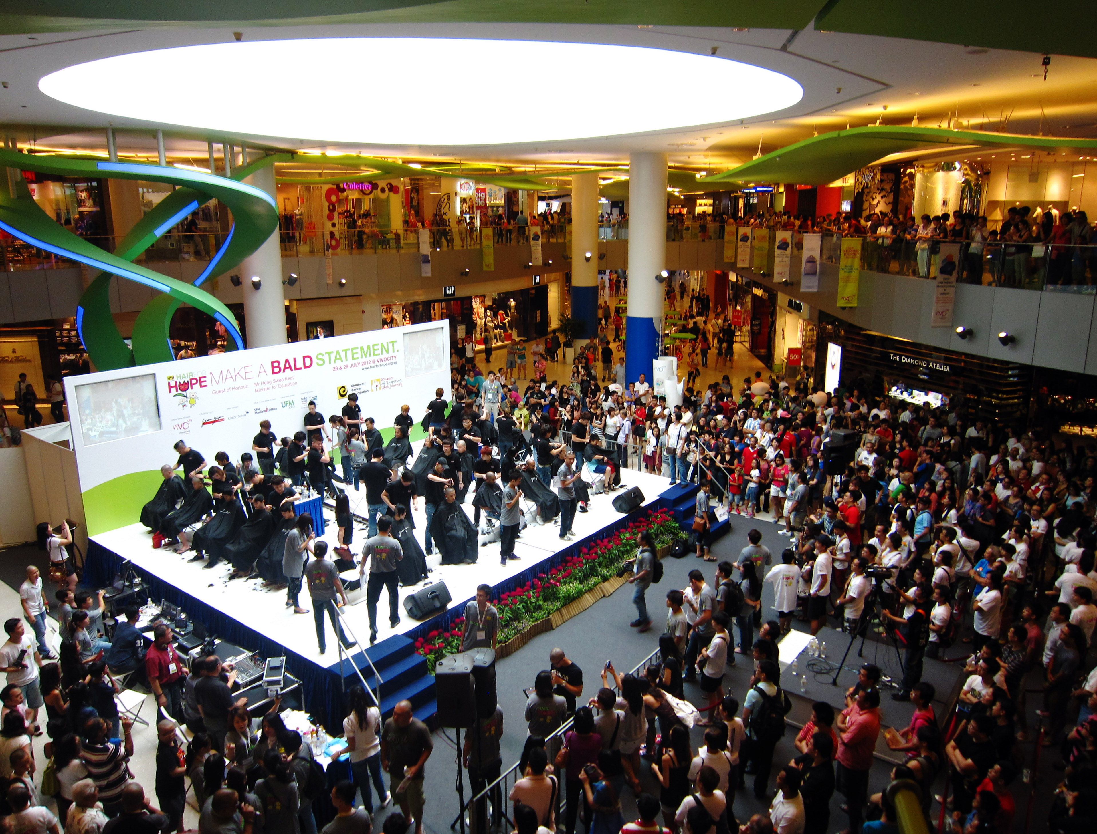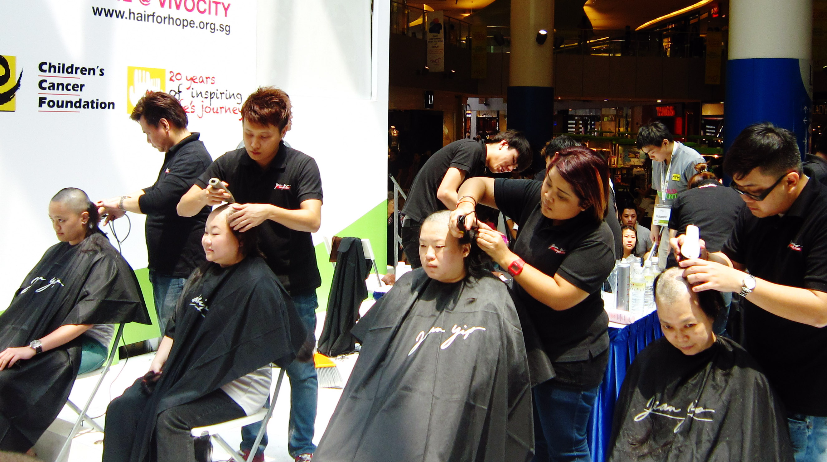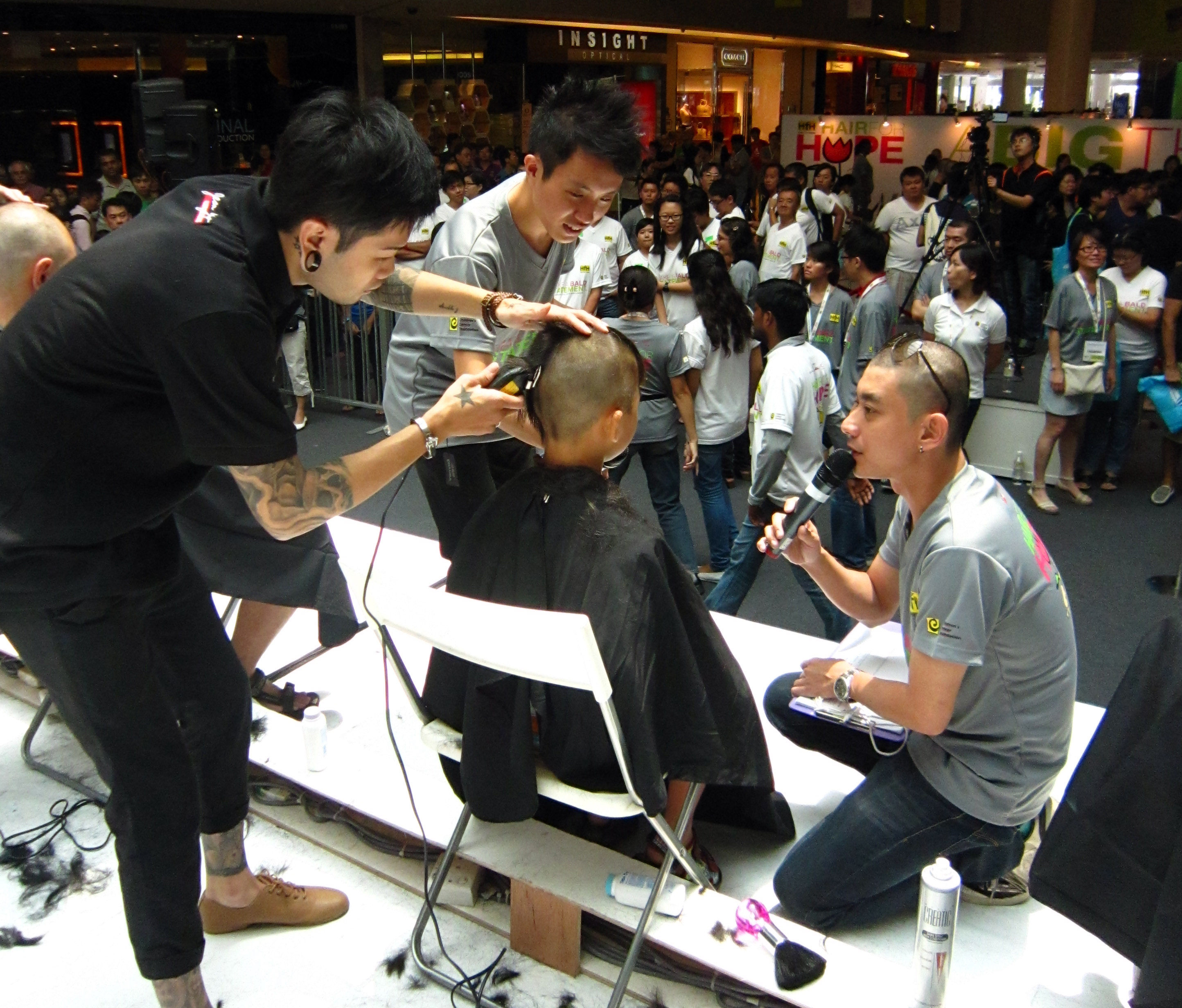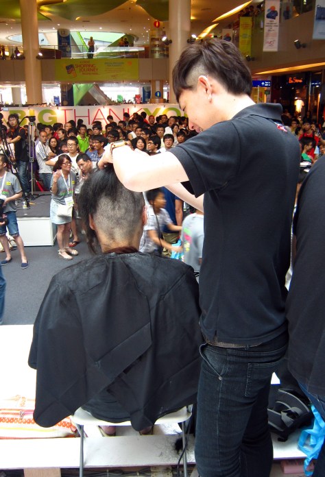 I’ve bungeed off ledges and jumped off cliffs — but on the subject of allowing someone to clip off all my hair, I’m afraid I’ll have to wimp out, thank you. Going for something less-thrilling-but-still-relevant instead, I volunteered to be a stage sweeper in this year’s Hair for Hope fundraising event, organized by Singapore’s Children’s Cancer Foundation.