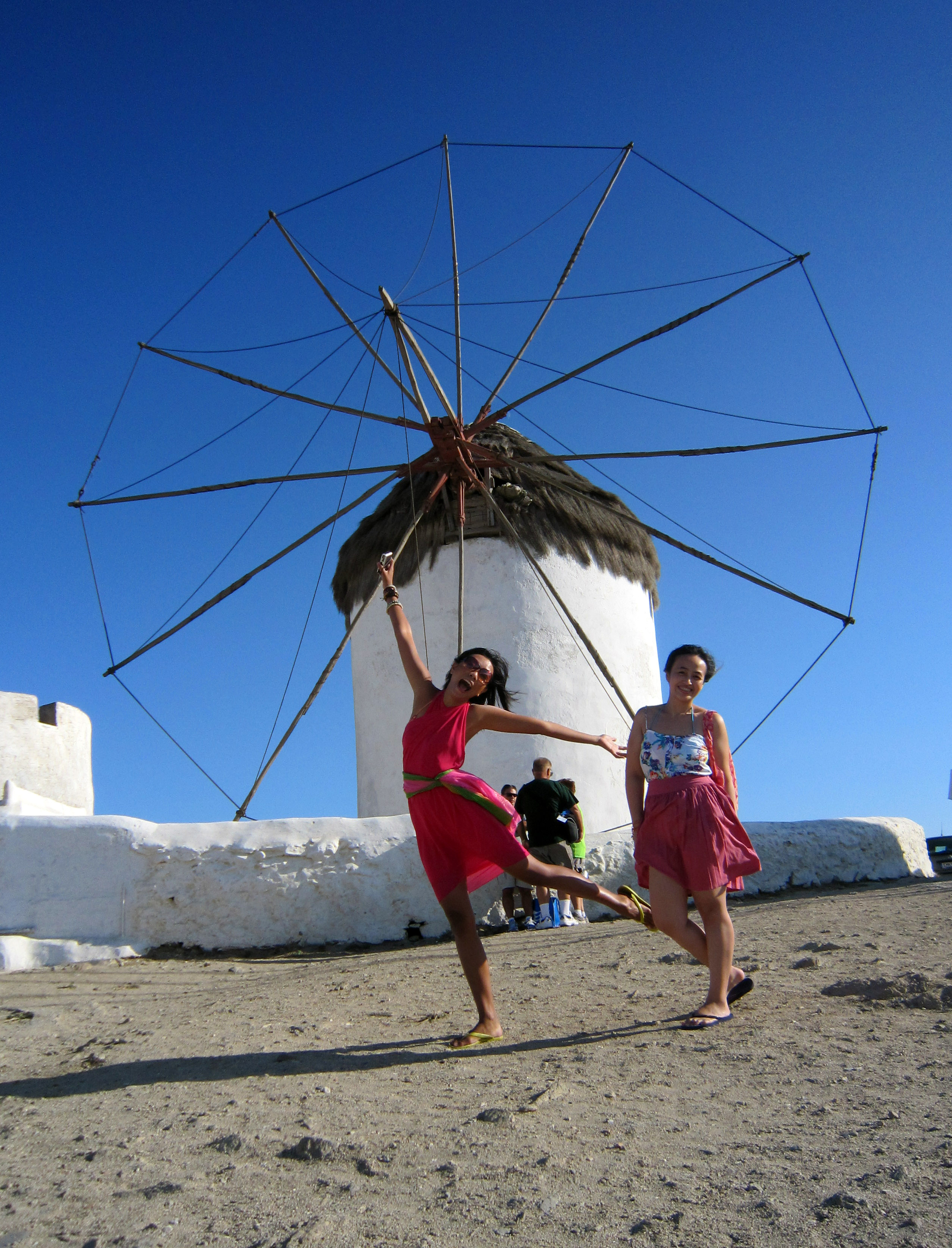 After a fun hostel overnighter fueled by pub-karaoke and local beer, we dragged ourselves out of bed and set off for Port Piraeus in the early morn. We were to jumpstart our island-hopping adventure with Mykonos as our first stop, and I could hardly keep myself from being giddy. As a child, I always thought that the Greek Isles were only something I’d lay eyes upon while watching snotty tanned lovey-dovey couples on The Lives of the Rich and Famous. Now, not only was I being whisked off via ferry to the Cyclades, but on a rare treat, I was sharing the rush of experiencing something new with two very good friends!