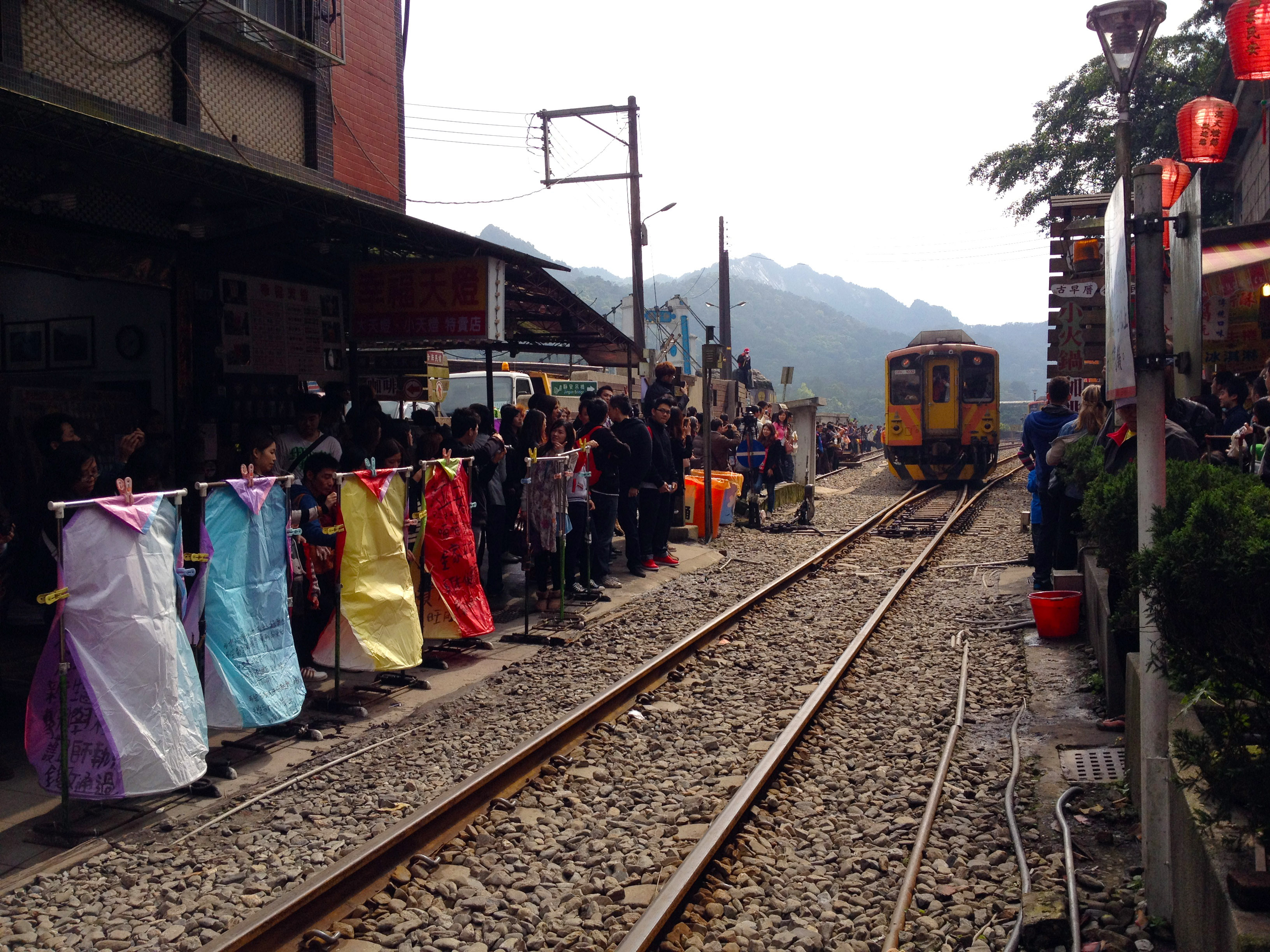 Fate stepped in, and my friends and I found ourselves in what usually must be the sleepy town of Pingxi — if not for the hundreds of tourists who were milled in by the trains for this occasion. The train was an interesting sight in itself too; you could literally stroll by the tracks (in fact, most of the lanterns were released right on the rails) and reach out to give the train a pat in the back for a job well done.
