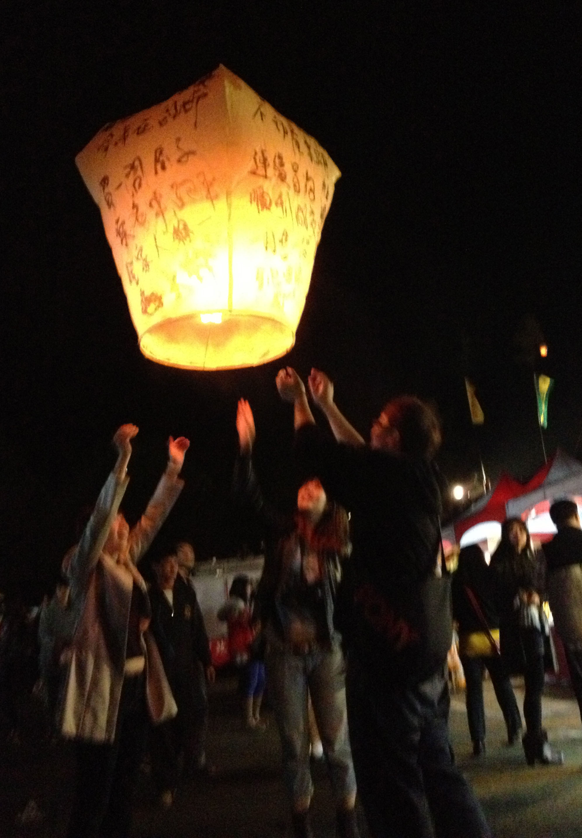 After scoring some world-class calamari just hawked off the street, we walked a bit in search of a good place to get our lanterns. Grandma’s Flying Lanterns certainly looked bustling; we got a multi-colored one for NT 150. The ladies, obviously used to the chaos of the festival, expertly navigated through the crowd and hung the lantern for us on the rack. In no time, we were setting our hearts’ desires down in ink — more adventures, success, love in our lives. Luckily, we already had the ‘good, lasting friends’ down, so no need to worry about that. 🙂