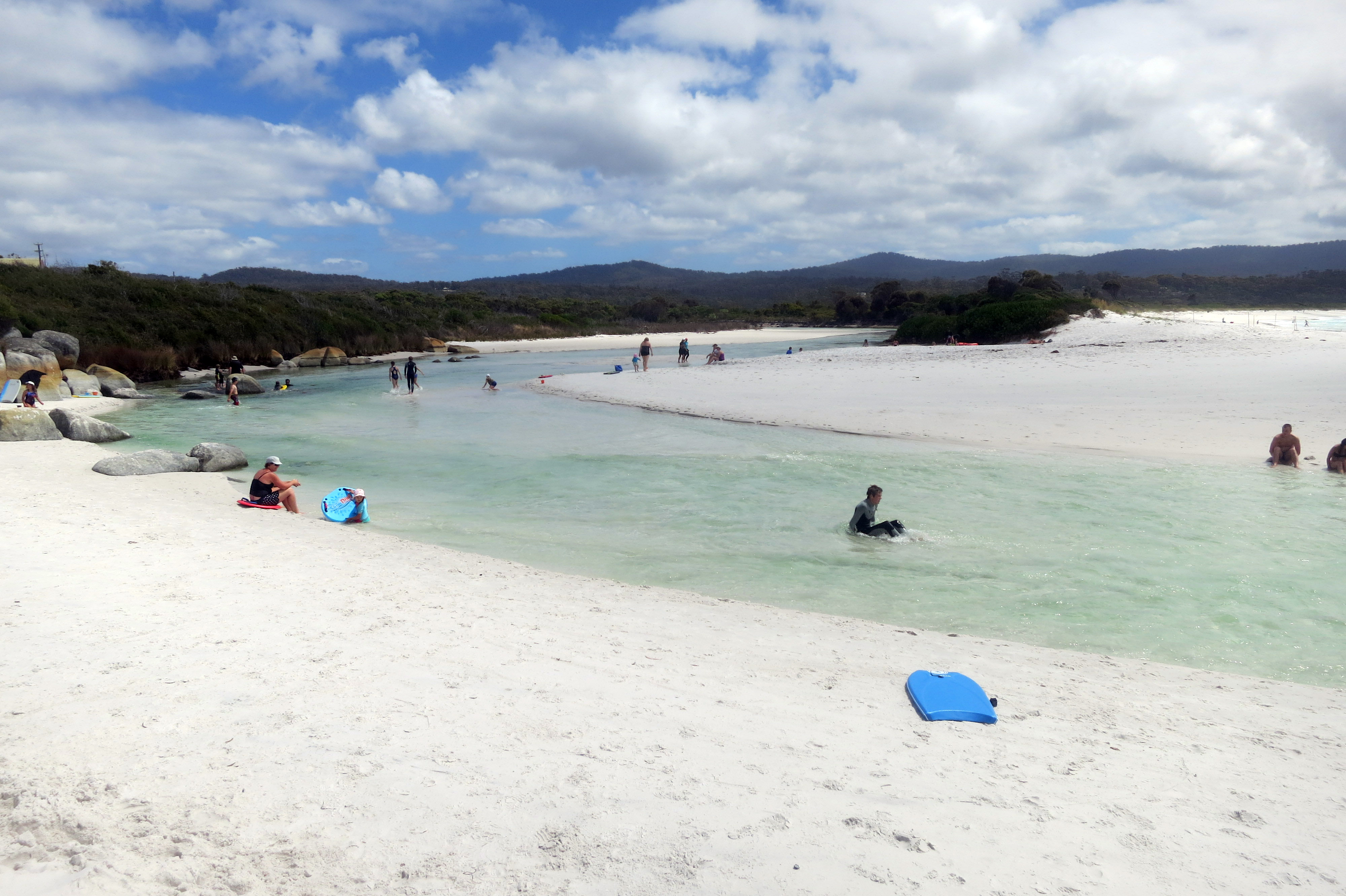 Families enjoying the natural whirlpool and sandbars of the Bay of Fires.