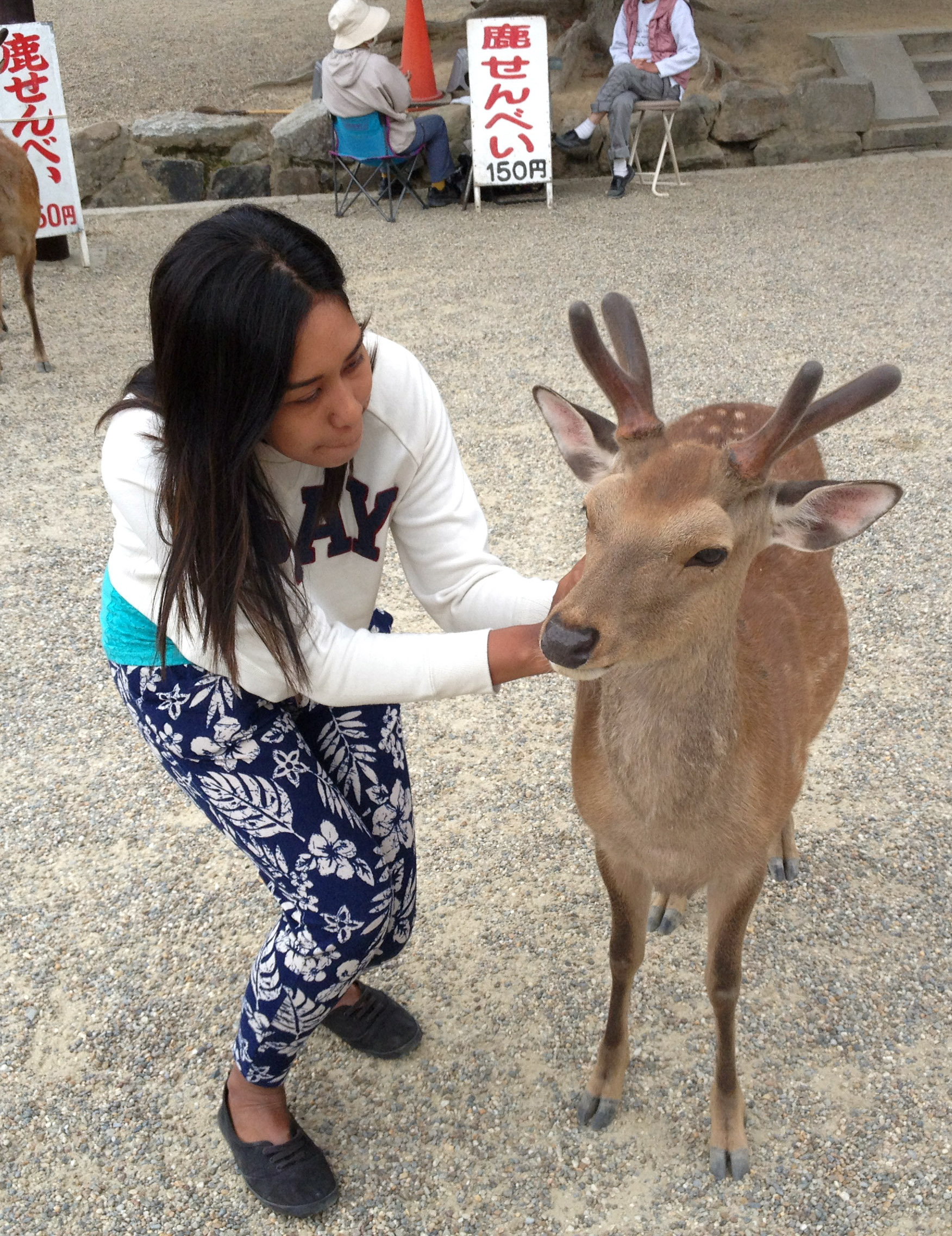 Although they were not very tall and bulky, I was still very hesitant to go near them at first (most likely, it was because of the antlers). Our four-legged friends turned out to be very easygoing though, even letting you touch their velvety crowns. If you REALLY want them to be happy to see you, you can buy a pack of the ‘deer cookies’ peddled for 150 yen everywhere in Nara; you’d be the most popular guy around.