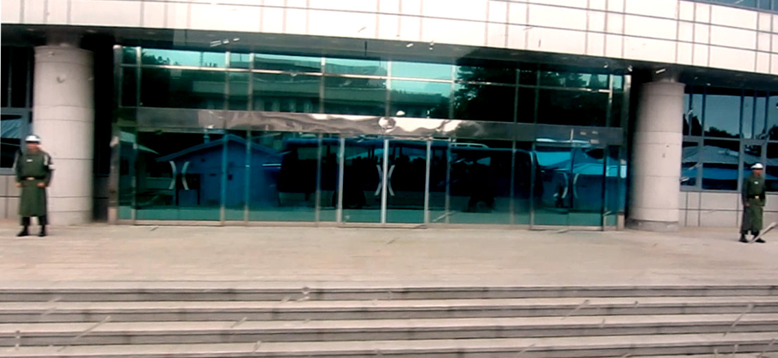 In the center of the JSA is a row of buildings, built right on top of the concrete border where North Korea and South Korea touch. It is inside these abodes where both parties conduct their talks face-to-face, sitting on opposite sides of long conference tables which straddle the border. After we had our fill of photos from the platform, our guide motions for us to get back in line, and to follow her into one of the conference buildings.