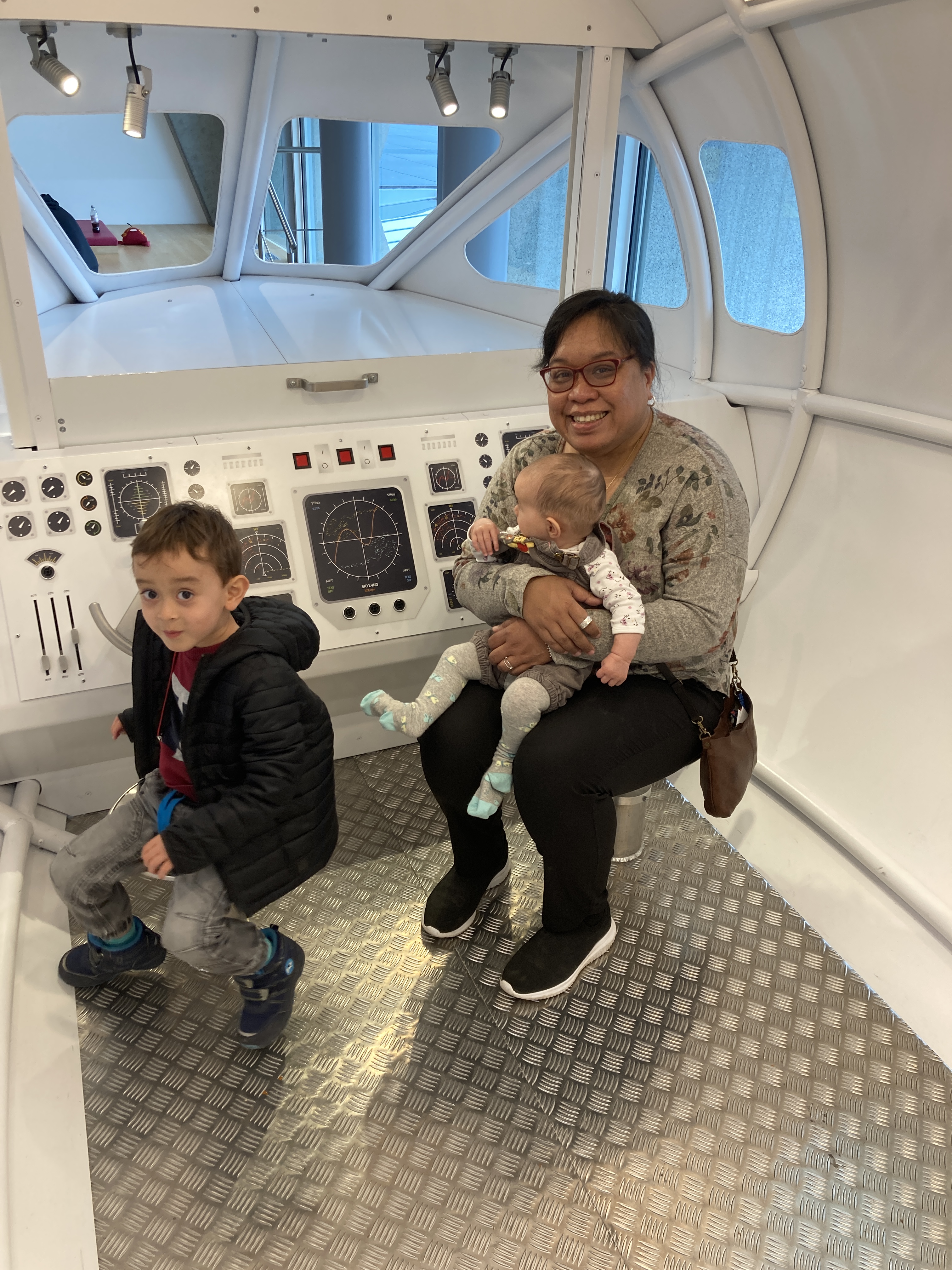 Behind all the last-minute travel kiosks in Terminal 3, we found Skyland, a small airplane-themed play area with different stations to keep kids busy. There was a giant play turbine, a small arcade game, and several screen terminals where kids can play videos to learn more about flying and what goes on in an airport. What was a hit for my toddler was the giant plane model where you could walk in and sit at a make-believe cockpit, complete with the busy dashboard and spinning chairs.